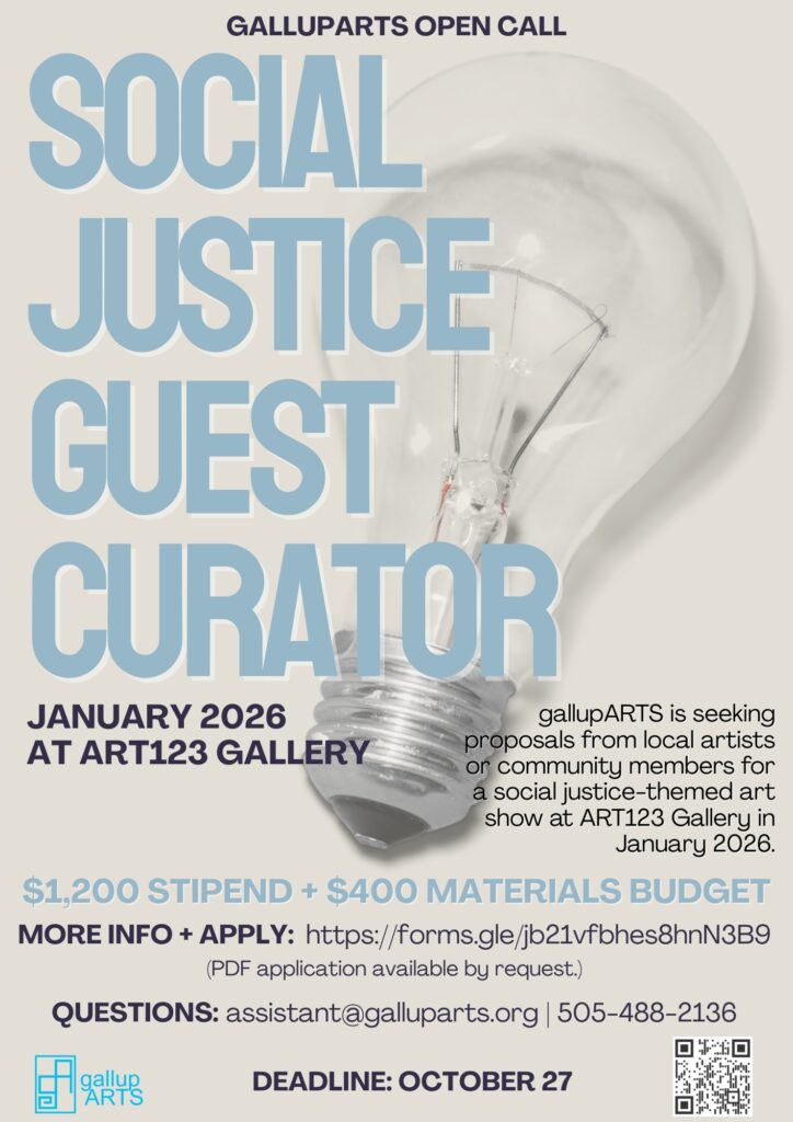 gallupARTS is seeking proposals from local artists or community members for a social justice-themed art show at ART123 Gallery in January 2026.