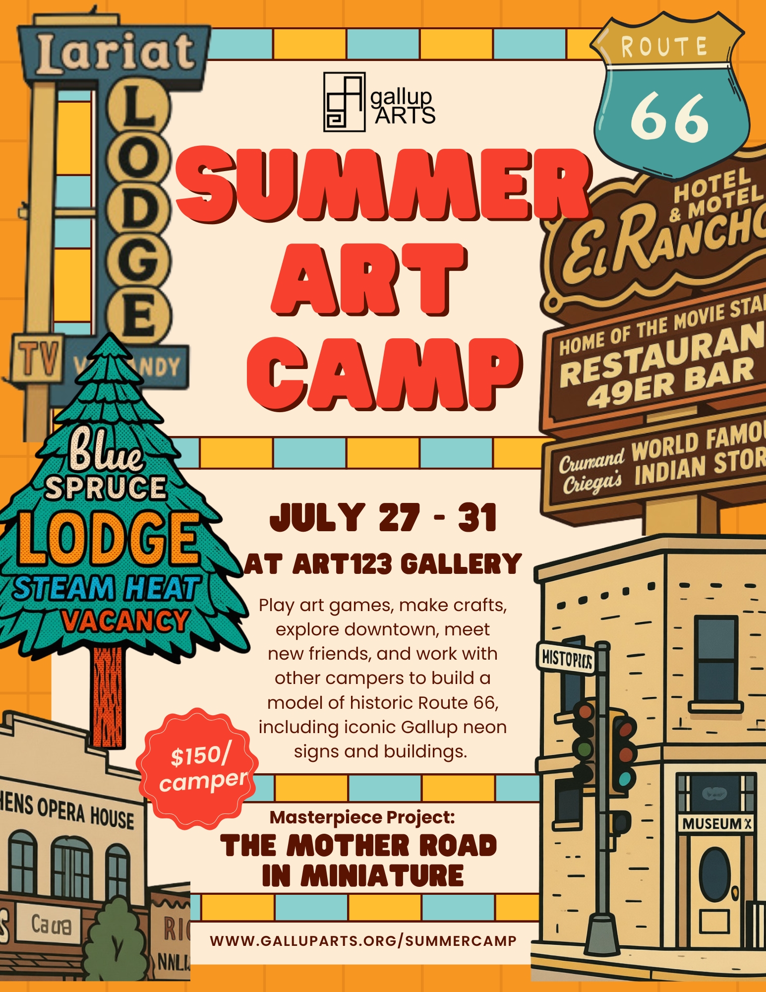 10:30am – 12:00pm: “Masterpiece” Project Workshop: The Mother Roach in Miniature – Work together with your fellow campers to buil a model version of historic Route 66, including iconic Gallup signs and buildings.